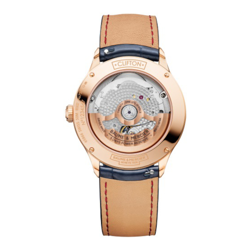 Denna Clifton Baumatic-klocka, som är certifierad som en COSC-kronometer, förenar teknisk briljans med modern stil. Den har en polerad boett och en krona i 18K roséguld, samt en grå lackerad urtavla med en diskret färgövergång.
