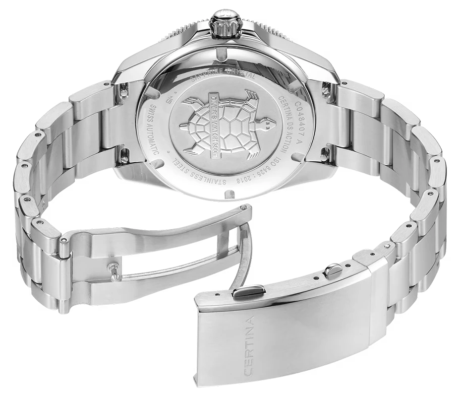 Modellen är certifierad enligt ISO 6425:2018 och uppfyller därmed de högsta internationella kraven för professionella dykarklockor. Den markerar dessutom en viktig milstolpe för Certina som den första klockan utrustad med “New DS Concept Extreme Shock Resistance” – nästa steg i det välkända Double Security-systemet.