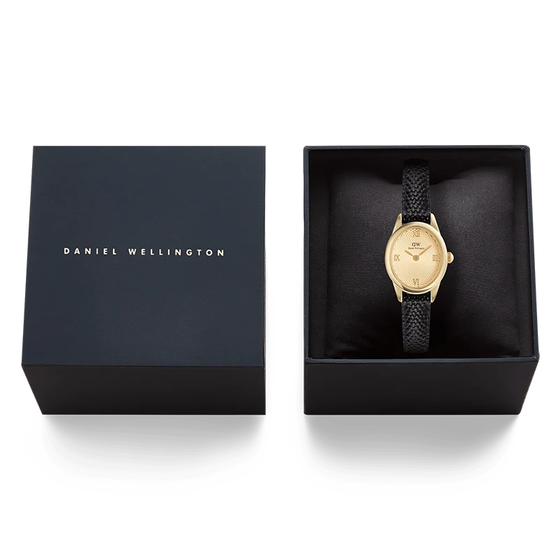 Det svarta läderbandet introducerar en ny tolkning av ödlestruktur, präglat i kromfritt äkta läder för att skapa en fin, taktil yta utan exotiska material. Bandet smalnar av för en bekväm passform och hålls på plats med ett polerat spänne. Kombinationen av svart band och guldfärgad urtavla gör klockan mångsidig och lätt att bära både till vardag och vid mer uppklädda tillfällen. Ett japanskt kvartsurverk säkerställer pålitlig precision och gör modellen till ett självklart val för kvinnor som uppskattar stilrena damklockor med genomtänkta detaljer.