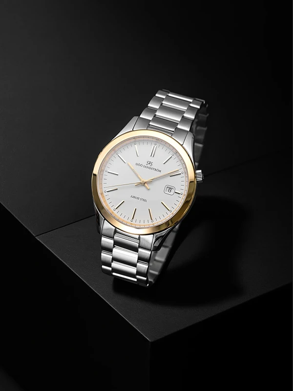 Med sin tunna profil på endast 8,75 mm och en balanserad diameter på 40 mm sitter Jubilee Steel bekvämt och elegant på handleden, oavsett om den bärs av dam eller herr. Den rena urtavlan med vita index och visare fyllda med Super‑LumiNova® ger utmärkt läsbarhet och ett sobert, klassiskt uttryck. Kombinationen av boett i rostfritt stål och bezel med PVD-guld tillför en varm och exklusiv detalj som lyfter helhetsintrycket utan att ta över. Den graverade och individuellt numrerade boettbaksidan ger möjlighet till personlig gravyr vilket gör modellen till ett särskilt uppskattat gåvour.