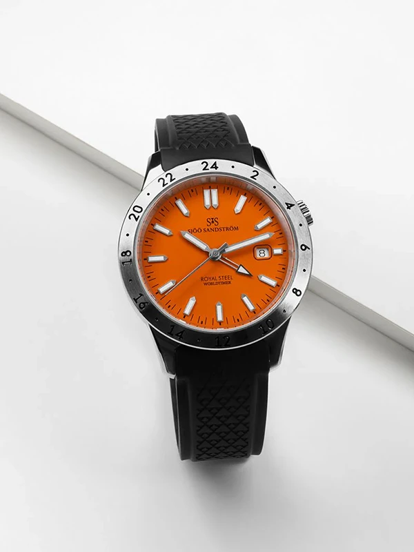 Den orange urtavlan ger Royal Steel Worldtimer ett sportigt och energiskt uttryck som sticker ut, samtidigt som den behåller den sobra elegans som kännetecknar Royal Steel‑familjen. De rena streckindexen och visarna är fyllda med Super‑LumiNova® för utmärkt läsbarhet dag som natt. Den extra timvisaren gör det enkelt att hålla koll på en andra tidszon, perfekt vid resor eller internationellt arbete. För optimal bärkomfort är kronan placerad kl. 2, vilket minskar tryck mot handleden. Den slimmade boetten på endast 9 mm gör att klockan sitter elegant och bekvämt, medan det svarta gummiarmbandet tillför både komfort och en mer aktiv, sportig karaktär.
