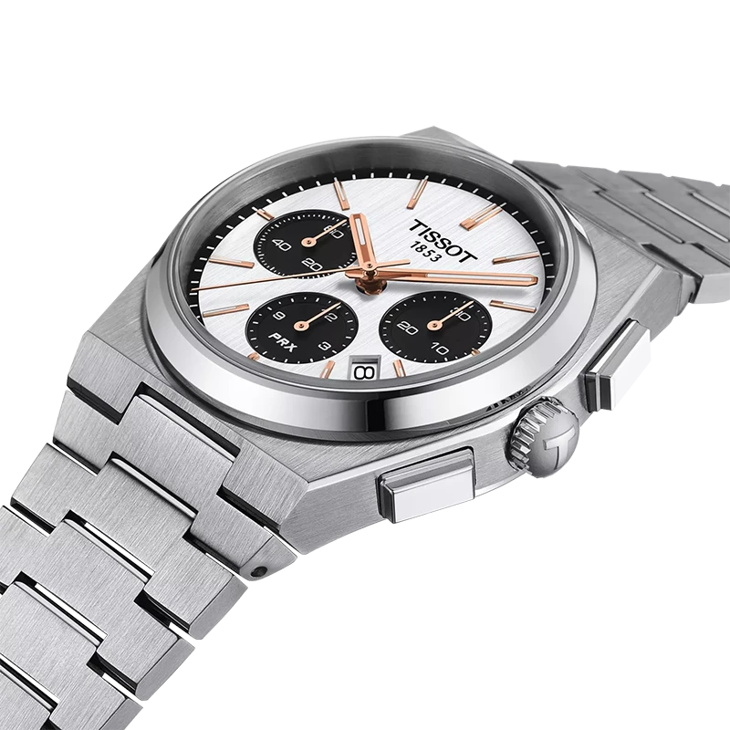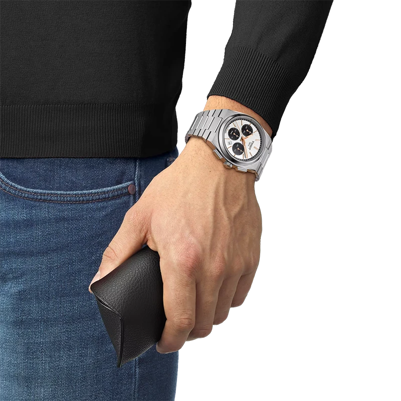 Den ikoniska tonneauformade boetten med satinborstade ytor och det integrerade stålarmbandet ger PRX Chrono dess omisskännliga retroprofil. Den vita kontrasttavlan i klassisk “panda”-stil förstärker klockans sportiga uttryck och ger tydlig läsbarhet i alla situationer. Med sin storlek på 42 mm och ett välbalanserat case bjuder klockan på en robust, men ergonomisk känsla – skapad för att bäras med självklarhet hela dagen.